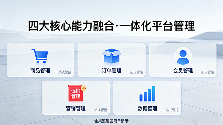 4.一体化平台管理:所有功能均集成于统一、强大的后台管理系统。实现商品、订单、会员、营销、数据的一站式管控,让复杂的全渠道运营变得简单清晰。